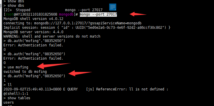 使用用户名密码例如:db.auth("mofing","8835")