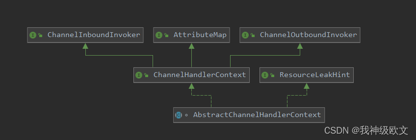 可以看到ChannelHandlerContext具体有一个抽象实现AbstractChannelHandlerContext,而AbstractChannelHandlerContext的默认实现是DefaultChannelHandlerContext,在DefaultChannelHandlerContext中就有一个handler的成员变量,也就是上图中所包装的handler。那么这个ChannelHandlerContext的作用到底是干嘛的呢?netty在这里设计的它的作用是什么呢?其实handler的某一个事件方法进行链式调用的时候,具体链式调用就是靠ChannelHandlerContext实现的,因为毕竟我们可以看到pre和next这两个指针是在AbstractChannelHandlerContext中,那么我们下面就具体看下ChannelHandlerContext是如何实现handler方法的链式调用的,在pipeline中有很多fireChannelXXX的方法,这些方法分别对应着每一个事件从head节点的handler事件链式调用,如下图: