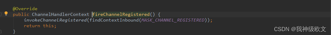 如果我们想要在这个pipeline中传递channelRegistered这个事件,那么就需要调用pipeline的fireChannelRegistered方法,该方法就可以从head节点开始对channelRegistered这个事件进行handler的链式调用了,我们点进去看一下