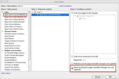 和步骤2一样,添加"在当前窗口中打开链接”动作。但是在右边配置链接页面时,要设置“返回上一页”选项。