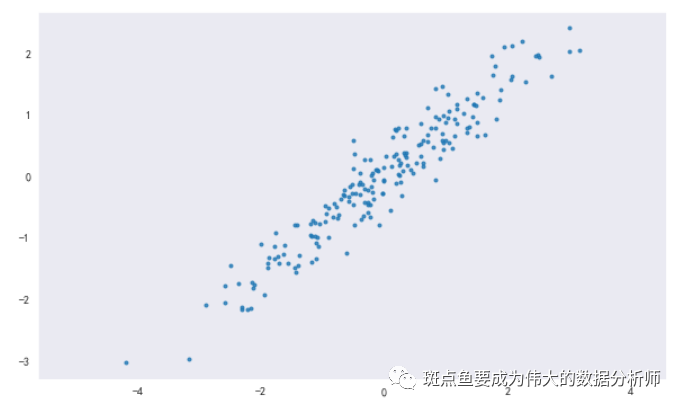 # 数据创建rng = np.random.RandomState(8)data = np.dot(rng.rand(2,2),rng.randn(2,200)).Tdf = pd.DataFrame({'X1':data[:,0],'X2':data[:,1]})print(rng)print(df.head())print(df.shape)plt.figure(figsize =(10,6))plt.scatter(df['X1'],df['X2'], alpha = 0.8, marker = '.')plt.axis('equal')plt.grid()