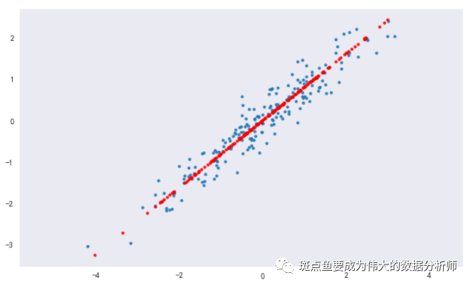 # 构建模型,分析主成分pca = PCA(n_components = 1) # n_components = 1 → 降为1维pca.fit(df) # 构建模型# sklearn.decomposition.PCA(n_components=None, copy=True, whiten=False)# n_components: PCA算法中所要保留的主成分个数n,也即保留下来的特征个数n# copy: True或者False,默认为True → 表示是否在运行算法时,将原始训练数据复制一份# fit(X,y=None) → 调用fit方法的对象本身。比如pca.fit(X),表示用X对pca这个对象进行训练# components_:返回具有最大方差的成分。# explained_variance_ratio_:返回 所保留的n个成分各自的方差百分比。# n_components_:返回所保留的成分个数n。print(pca.explained_variance_) # 输出特征值print(pca.components_) # 输出特征向量print(pca.n_components_) # 输出成分的个数print('-----')# 这里是shape(200,2)降为shape(200,1),只有1个特征值,对应2个特征向量# 降维后主成分 A1 = 0.7788006 * X1 + 0.62727158 * X2# 主成分分析,生成新的向量x_pca# fit_transform(X) → 用X来训练PCA模型,同时返回降维后的数据,这里x_pca就是降维后的数据# inverse_transform() → 将降维后的数据转换成原始数据x_pca = pca.transform(df) # 数据转换x_new = pca.inverse_transform(x_pca) # 将降维后的数据转换成原始数据print(x_new[:10])print(df.head())print('original shape:',df.shape)print('transformed shape:',x_pca.shape)print(x_pca[:5])print('-----')plt.figure(figsize =(10,6))plt.scatter(df['X1'],df['X2'], alpha = 0.8, marker = '.')plt.scatter(x_new[:,0],x_new[:,1], alpha = 0.8, marker = '.',color = 'r')plt.axis('equal')plt.grid()