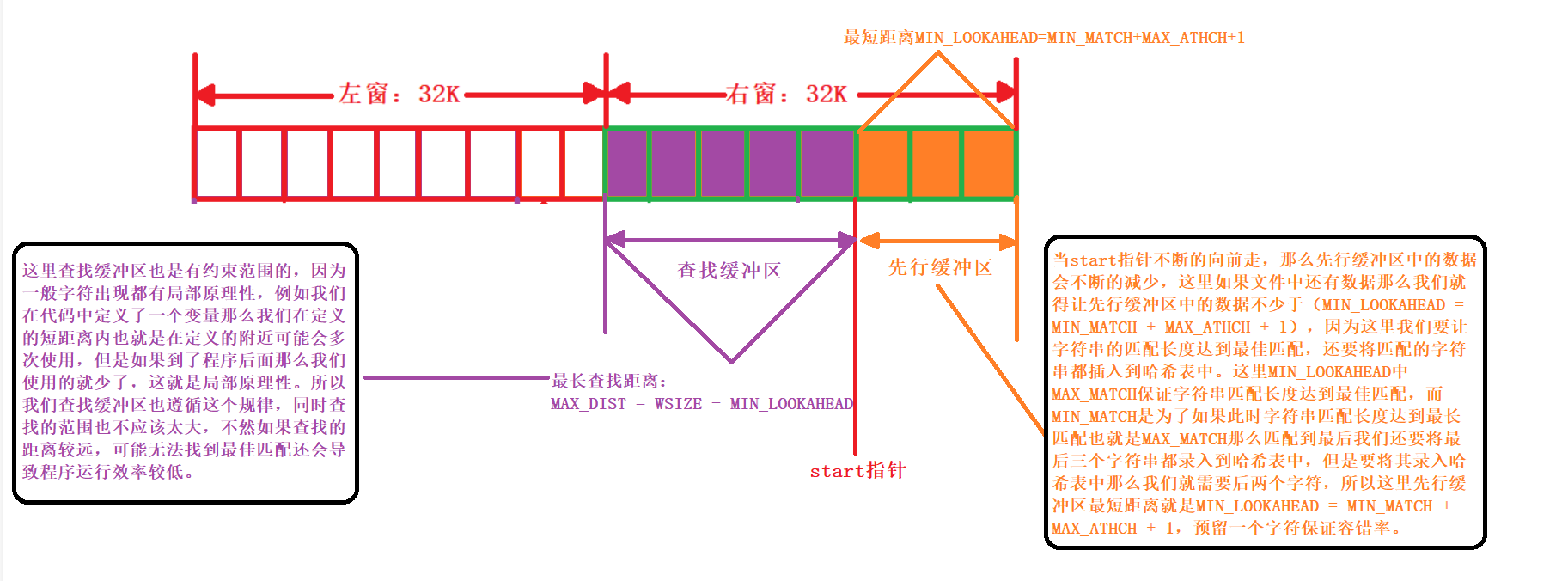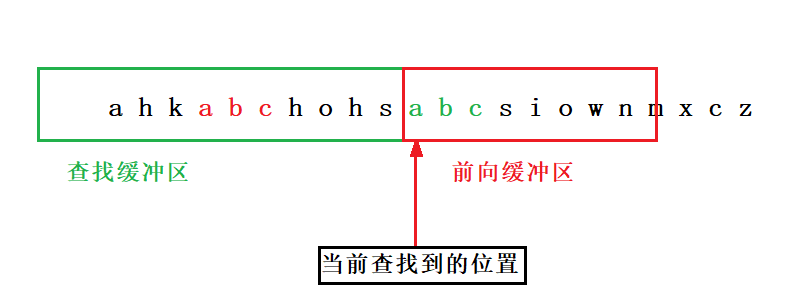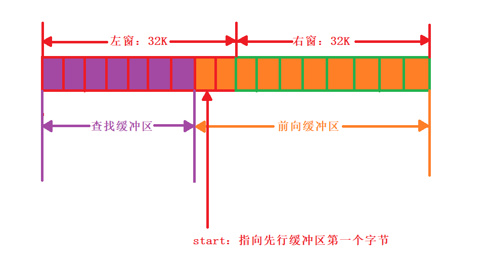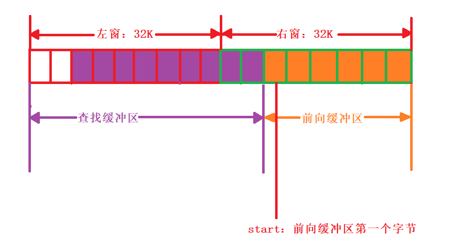 - 查找缓冲区:查找缓冲区就是我们已经查找过的区域,我们从查找缓冲区的开始来查找当前字符的匹配。(这里查找缓冲区大小为32K)