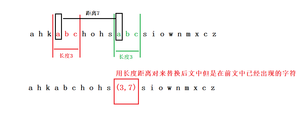 - lz77算法就是在文中找到重复的子串然后用长度距离对来替换重复的子串。(长度距离对:表示在前文中当前字符串在前文中出现,长度表示当前长度的字符串在前文中出现的长度,距离表示两个字符串相距的距离。)以达到将文件中重复出现的字符串减少压缩个数。