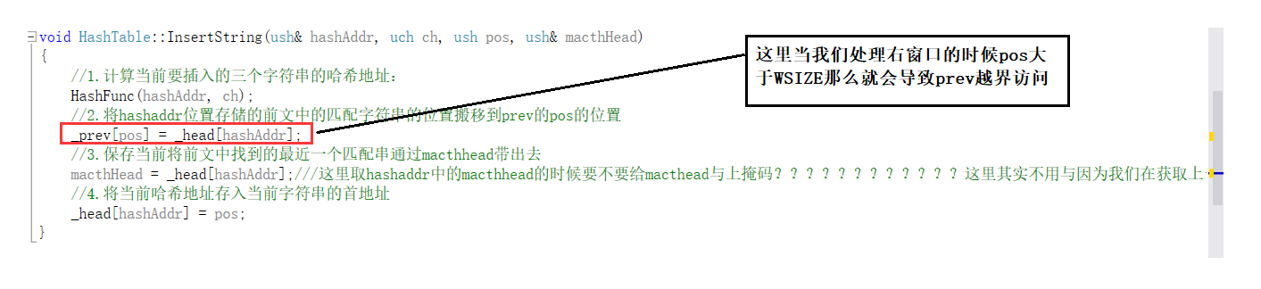 - 因为我们在构造哈希表的时候我们的哈希表中有两个指针head和prev。分别指向一块WSIZE大小的空间,那么当我们处理右窗的数据的时候,数据的下标都是大于WSIZE的那么我们在插入哈希表的的时候就会越界。