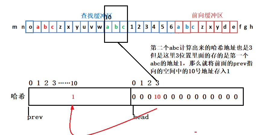 - 用上面的扫描abc的例子我们来说明:当第一次扫描到abc时,在3位置在哈希中存放的是0,所以在abc之前没有出现过abc,那么也就无法将第一个abc替换为长度距离对。当扫描到第二个abc的时候在哈希表中存放的是1,那么将当前3号空间中存放的1存放到prev空间中的10号位置,此时查看prev中的10位置存放的字符是否是0,这里10位置存放的1那么我们就匹配当前abc字符串后面的字符和1位置abc后面的字符,记录最长匹配长度。然后再查找prev1号位置存放地址是多少发现是0那么此次匹配结束。我们可以将当前abc字符替换为长度距离对。(这里存储在相同位置的字符串也不一定是同一个字符串,所以这里我们查找的时候需要判断,判断前一个字符串是否是与当前字符串相匹配。)