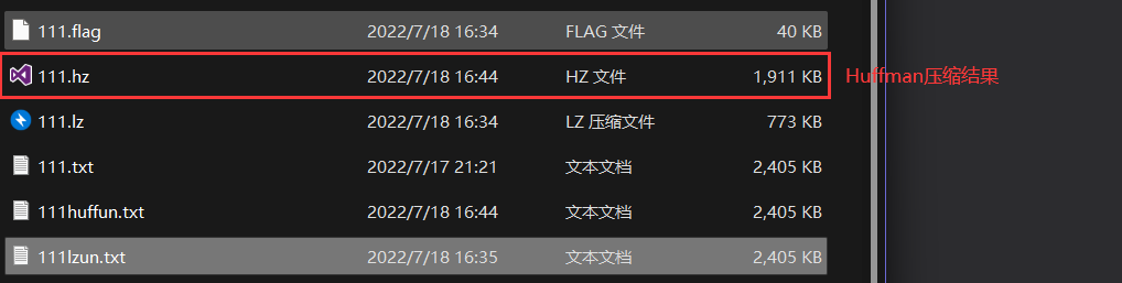 我们再来看Huffman压缩,可以看到也是压缩完之后文件变大了但是比LZ77要好一点。
