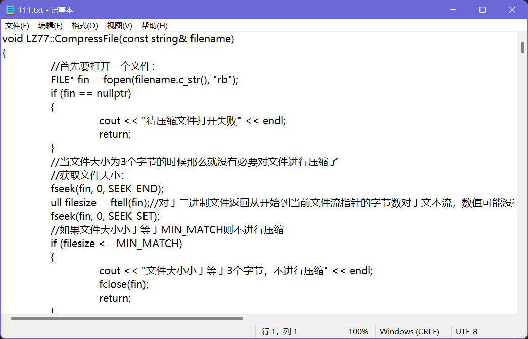 <LZ77.h>文件 //用来声明LZ77 #pragma once #include "HashTable.h" #include "common.h" class LZ77 { public: LZ77(); ~LZ77(); void CompressFile(const string& filename); void UNCompressFile(const string& filename); string Getfilename(const string& filename); string Getfilepostfix(const string& file_name); ush maxlenth(ush start, ush match_head, ush& matchdis); void WriteFlaginfo(FILE* fp, ush match_head, uch& bitinfo, uch& bitcount); void Filldata(ush &start, FILE* fin, size_t &looksize); private: uch* _pWin;//用来读取文件的窗口大小 HashTable _ht; };<LZ77.cpp>文件 //用来实现LZ77 #define _CRT_SECURE_NO_WARNINGS #include "LZ77.h" LZ77::LZ77() :_pWin(new uch[2*WSIZE]) ,_ht() {} LZ77::~LZ77() { if (_pWin) { delete[] _pWin; } } //压缩文件 void LZ77::CompressFile(const string& filename) { //首先要打开一个文件: FILE* fin = fopen(filename.c_str(), "rb"); if (fin == nullptr) { cout << "待压缩文件打开失败" << endl; return; } //当文件大小为3个字节的时候那么就没有必要对文件进行压缩了 //获取文件大小: fseek(fin, 0, SEEK_END); ull filesize = ftell(fin);//对于二进制文件返回从开始到当前文件流指针的字节数对于文本流,数值可能没有意义,但仍然可以用于在以后使用fseek将位置恢复到相同的位置(如果使用ungetc放回的字符仍在等待读取,则行为未定义)。 fseek(fin, 0, SEEK_SET); //如果文件大小小于等于MIN_MATCH则不进行压缩 if (filesize <= MIN_MATCH) { cout << "文件大小小于等于3个字节,不进行压缩" << endl; fclose(fin); return; } //文件压缩: //1.首先打开文件: string compressfilename = Getfilename(filename); compressfilename += ".lz"; FILE* fout = fopen(compressfilename.c_str(),"wb"); //2.先读取一个窗口的数据: size_t looksize = fread(_pWin, 1, 2 * WSIZE, fin); //3.在处理窗口数据循环插入之前我们要先获取前两个bit位的编码也就是前两个哈希编码 ush hash_addr = 0; ush match_head = 0; for (int i = 0; i < MIN_MATCH-1; i++) { _ht.InsertString(hash_addr, _pWin[i], i, match_head); } //这里我们不将标志位文件和压缩文件放在一起,而是分开,将标志位放到另一个文件当中 compressfilename = Getfilename(filename); compressfilename += ".flag"; FILE* flag = fopen(compressfilename.c_str(), "wb"); //将文件后缀名称也写入到标志位文件: string filepostfix = Getfilepostfix(filename); fwrite(filepostfix.c_str(), 1, filepostfix.size(), flag); fputc('\n', flag); uch bitinfo = 0;//要写入标志位文件的比特位 uch bitcount = 0;//写入比特位计数计数够8位就向文件中写入一次 ush start = 0;//当前字符插入的地方 ush matchdis = 0;//最长匹配距离//防止越界 ush matchlenth = 0;//最长匹配长度 while (looksize)//这里looksize是窗口的数据个数,这里我们将窗口中的数据全部处理完成那么我们的压缩也就结束了。 { match_head = 0; matchlenth = 0; //1.首先将每个字符插入哈希表: _ht.InsertString(hash_addr, _pWin[start + 2], start, match_head); if (match_head) {//这里如果match_head不为0的话那么就代表在前面找到了匹配串: matchlenth = maxlenth(start,match_head,matchdis); } if (matchlenth < MIN_MATCH) {//没有找到最长匹配:那么此时就将字符原封不动的写入到压缩文件 fputc(_pWin[start], fout); WriteFlaginfo(flag, 0, bitinfo, bitcount); start++; looksize--; } else {//找到了最长匹配:那么此时就将字符替换为长度距离对写入到压缩文件中 matchlenth -= 3;//因为这里matchlenth要表示3-258范围的匹配字节 fputc(matchlenth, fout);//长度写入 //fwrite(&matchlenth, 1, sizeof(matchlenth), fout); fwrite(&matchdis, sizeof(matchdis), 1, fout);//距离写入 WriteFlaginfo(flag, 1, bitinfo, bitcount);//将标志位写入 matchlenth += 3; looksize -= matchlenth; matchlenth--;//因为当前的字符已经插入到了哈希表中后面只需要将匹配的字符全部插入到哈希表中即可 start++; while (matchlenth--) {//将匹配区间内的元素都插入哈希表中因为匹配区间内的元素有可能是后文中的匹配串 _ht.InsertString(hash_addr, _pWin[start + 2], start, match_head); start++; } } //处理大文件:在处理大文件的时候当先行缓冲区中的数据少于最佳匹配元素个数的时候那么我们就要进行数据填充 if (start >= WSIZE + MAX_DIST) { Filldata(start,fin,looksize); } } if (bitcount > 0)//将最后一位没有写入到标志位文件当中的bit位信息写入 { bitinfo <<= (8 - bitcount); fputc(bitinfo, flag); } //将文件大小信息写入到文件的最后: fwrite(&filesize, 1, sizeof(filesize), flag); fclose(fin); fclose(fout); fclose(flag); } //数据填充: void LZ77::Filldata(ush &start, FILE* fin, size_t &looksize) { //1.将右窗中的数据都搬移到左窗 start -= WSIZE; memcpy(_pWin, _pWin + WSIZE, WSIZE); //2.那么向右窗中写入数据 if (!feof(fin))//如果文件走到末尾那么feof返回一个非0值 { looksize += fread(_pWin + WSIZE, 1, WSIZE, fin); } //3.更新哈希表: _ht.updatahash(); } //写标志位函数: void LZ77::WriteFlaginfo(FILE* fp, ush match_head, uch& bitinfo, uch& bitcount) { bitinfo <<= 1; if (match_head) { bitinfo |= 1; } bitcount++; if (bitcount == 8) { fputc(bitinfo,fp); bitcount = 0; bitinfo = 0; } } //求前后文最长匹配长度: //在这个函数中我们要求出从match_head开始和从start开始两者最长匹配长度和距离: ush LZ77::maxlenth(ush start,ush match_head,ush& matchdis) { //这里因为大文件加入了哈希掩码可能会导致哈希表成链状,所以这里我们要控制匹配次数最多匹配255次就够了 ush MaxMachthcount = 255; //这里因为匹配距离也就是查询距离还不可以超过MAX_DIST所以这里我们也要有所限制: ush limit = start >= MAX_DIST ? start - MAX_DIST : 0; ush max_lenth = 0;//这里最长匹配如果到了255之后如果再++那么就会加到0,1,2所以用ush来定义max