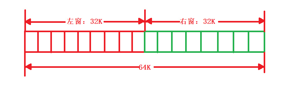 - 那么这里我们知道了左右窗口的总大小那么两个重复出现的字符串的最远距离就是64K那么也就是两个字节可以表示的范围,所以上面我们的长度距离对中的距离用两个字节来表示。