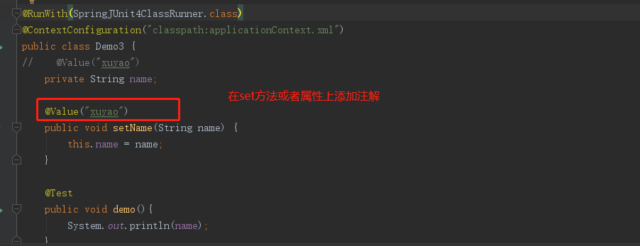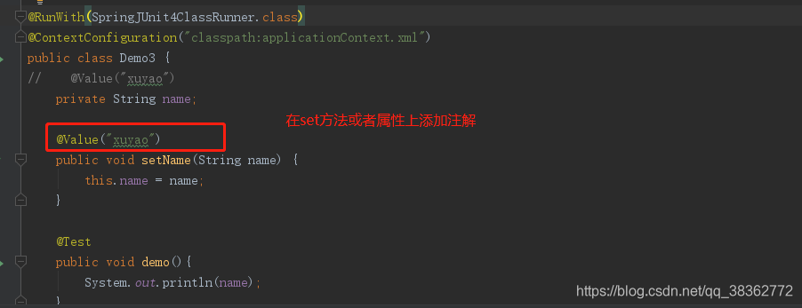 @Value:注入普通类型属性- 如果属性有set方法,注解需要加到set方法上,如果没有set方法直接在属性上添加注解。