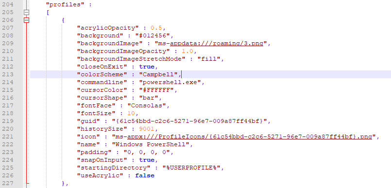 最后一步就是修改profiles.json文件,在文件204行找到profiles,修改 power shell 或 cmd 的配置。添加
