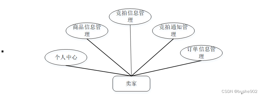 (3)卖家模块中的用户角色是卖家,卖家可以实现个人中心、商品信息管理、竞拍信息管理、竞拍通知管理、订单信息管理等功能。卖家模块用例图如图3-4所示。