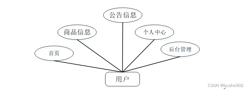 (2)用户模块中的用户角色是用户,用户可以实现首页、商品信息、公告信息、个人中心、后台管理等功能,用户模块用例图如图3-2所示。