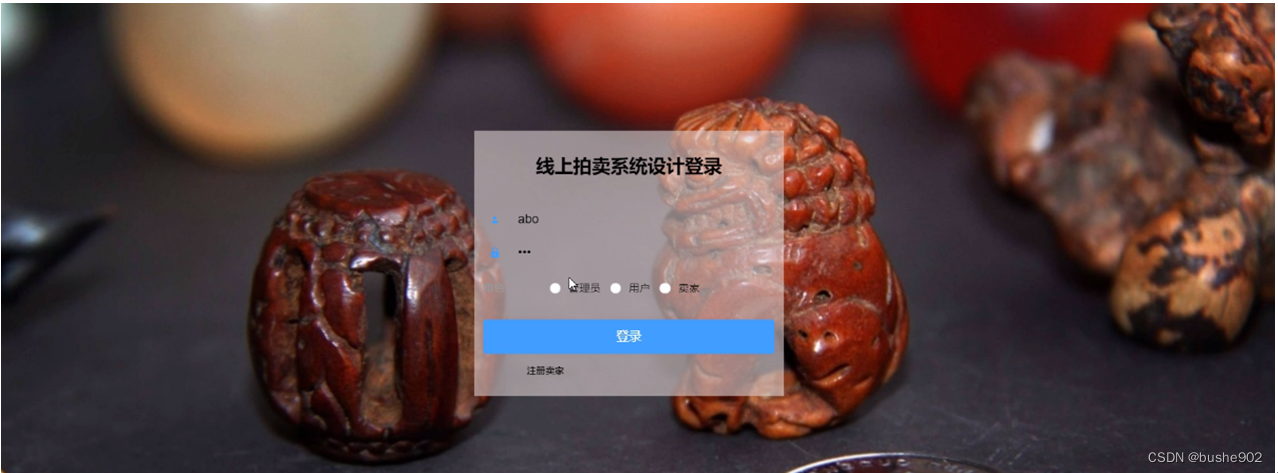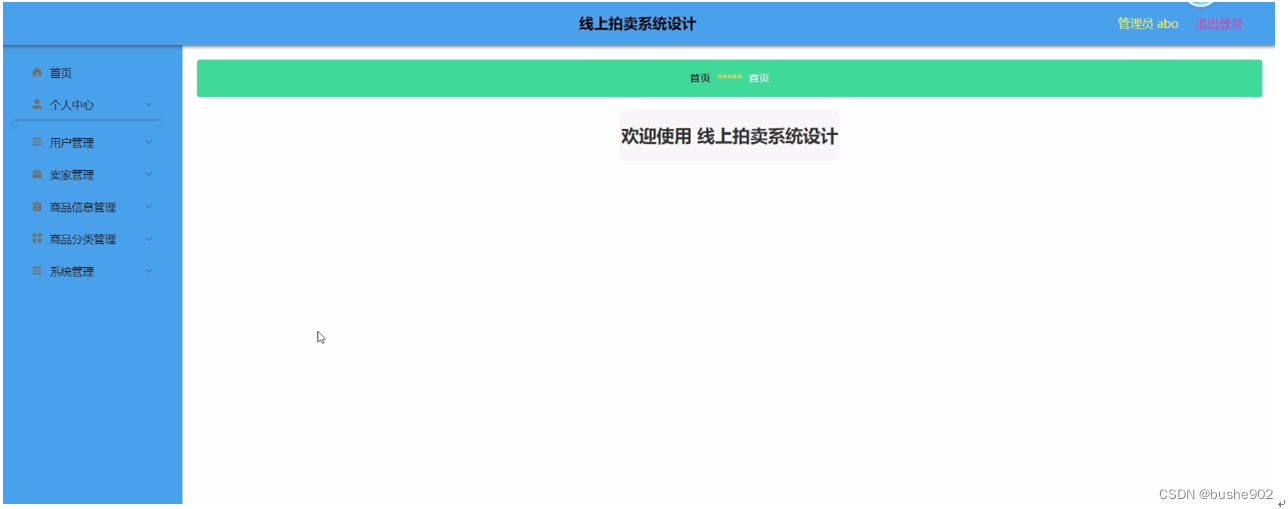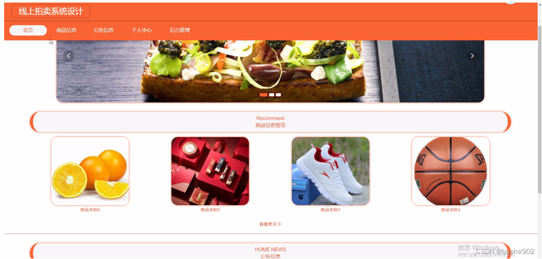 线上拍卖系统设计,在系统首页可以查看首页、商品信息、公告信息、个人中心、后台管理等内容进行详细操作,如图5-3所示。