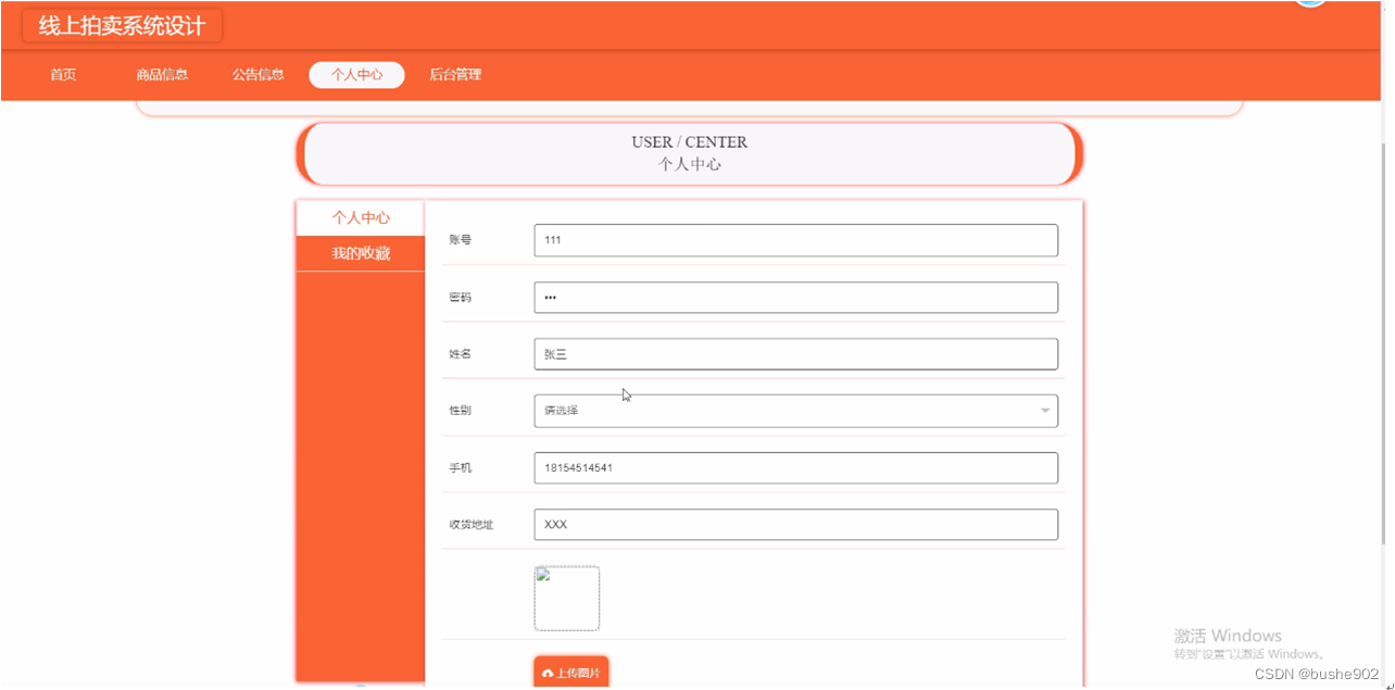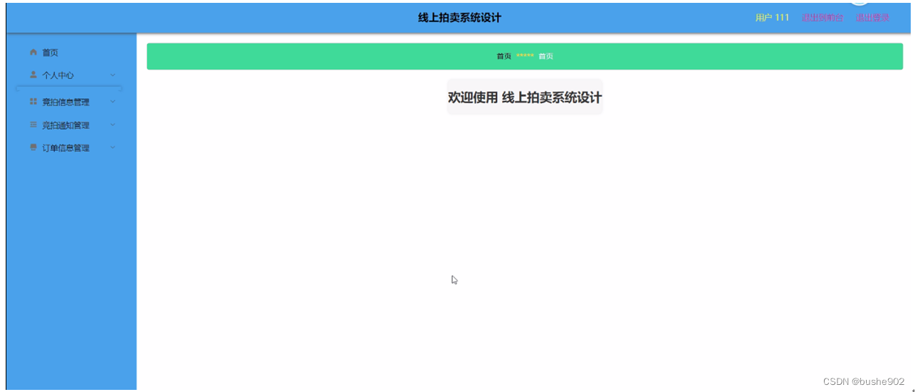 后台管理,用户进入系统后台可查看个人中心、竞拍信息管理、竞拍通知管理、订单信息管理等内容,如图5-7所示。