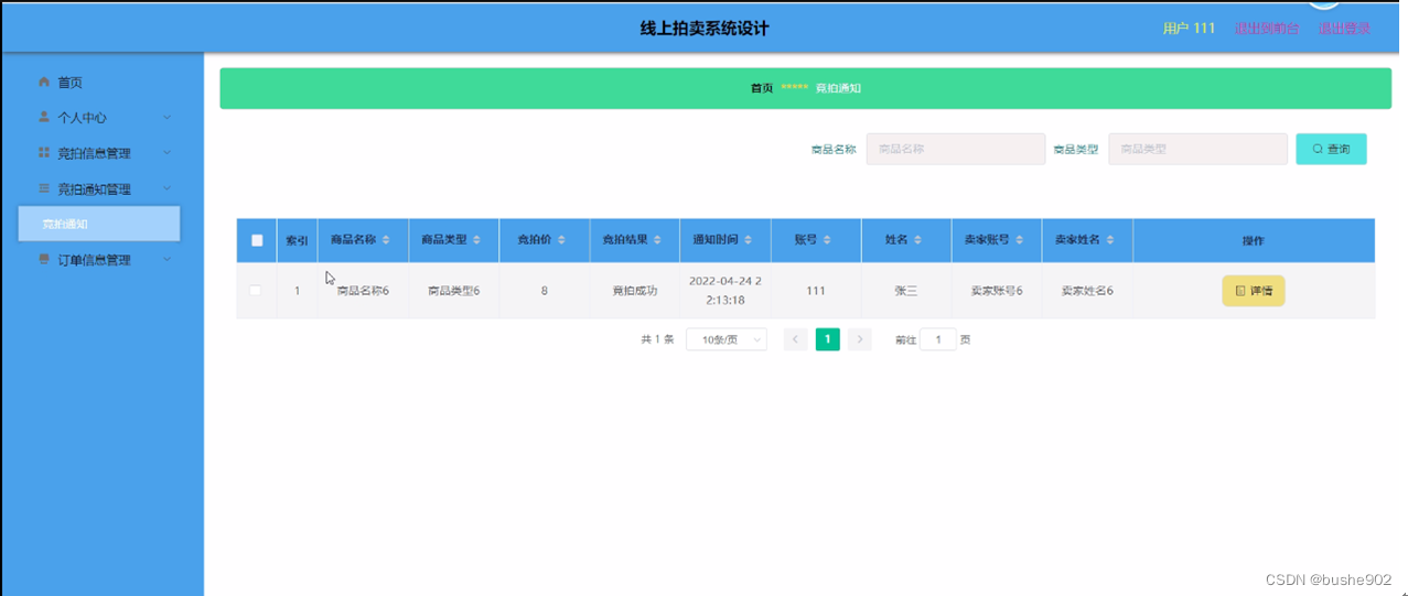 竞拍通知管理,用户可在竞拍通知管理页面查看商品名称、商品类型、竞拍价、竞拍结果、通知时间、账号、姓名、卖家账号、卖家姓名等内容,如图5-9所示。