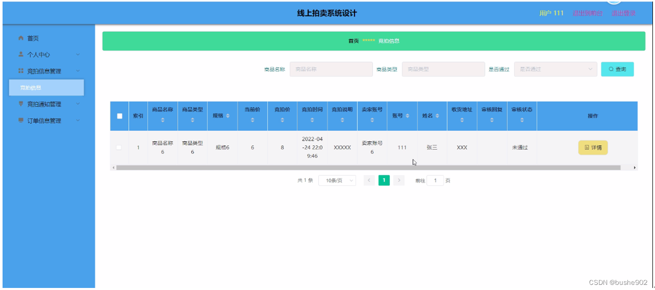 竞拍信息管理,用户可在竞拍信息管理页面查看商品名称、商品类型、规格、竞拍价、当前价、竞拍时间、竞拍说明、卖家账号、账号、姓名、收货地址、审核回复、审核状态等内容,如图5-8所示。