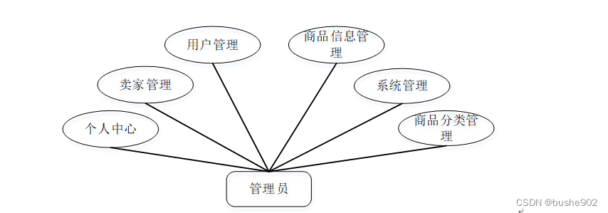 (3)管理员模块中的用户角色是管理员,管理员通过系统对可以实现网站系统管理,主要包括个人中心、用户管理、卖家管理、商品信息管理、商品分类管理、系统管理等功能。管理员模块用例图如图3-3所示。