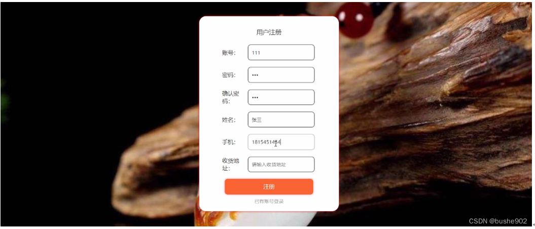 用户注册,在用户注册页面通过填写账号、密码、姓名、手机、收货地址进行注册,如图5-4所示。