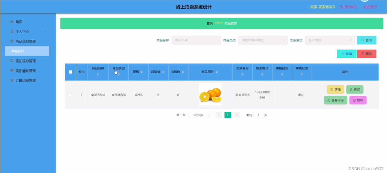商品信息管理,卖家可在商品信息管理页面查看商品名称、商品类型、规格、起拍价、当前价、商品图片、卖家账号、联系电话、审核回复、审核状态等内容,还可进行新增、修改、查看评论或删除等操作,如图5-11所示。