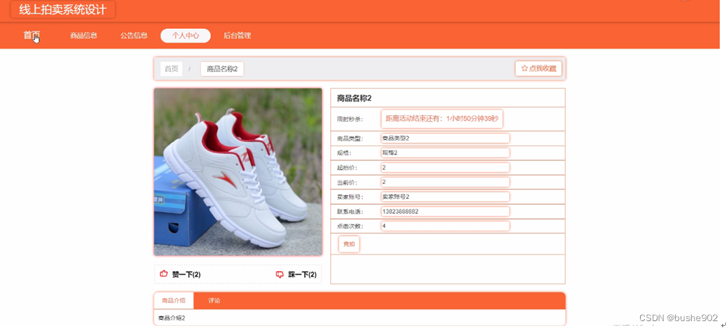 商品信息,用户可在商品信息页面查看商品名称、商品图片、限时秒杀、商品类型、规格、起拍价、当前价、卖家账号、联系电话、点击次数等内容,还可进行赞、踩、评论、竞拍或收藏等操作,如图5-5所示。