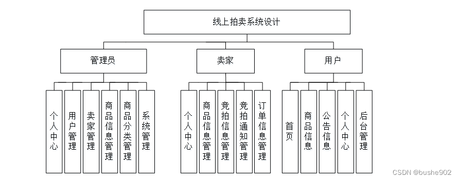 线上拍卖系统设计主要有三类用户,分别是卖家模块、用户模块和管理员模块,详细规划如图4-1所示。