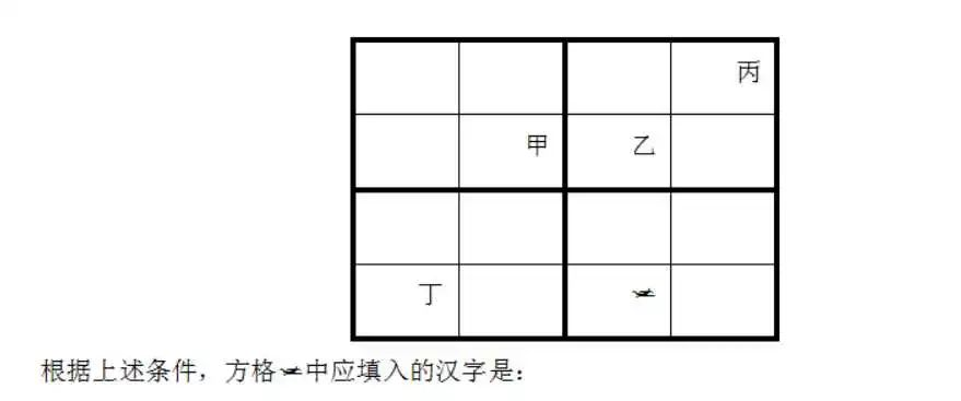 在下列4*4的正方形矩阵中,每个小方格可填入一个汉字。要求每行每列以及粗线框成的4个小正方形中均含有甲、乙、丙、丁4个汉字。