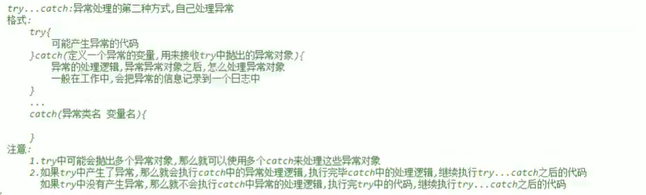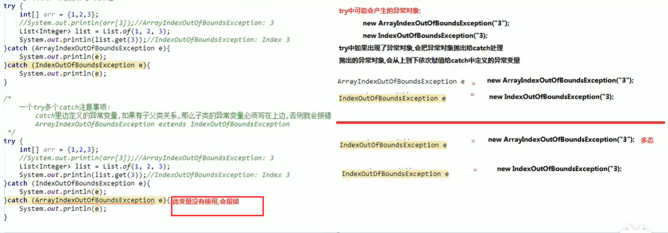 注意:这种异常处理方式,要求多个catch中的异常不能相同,并且若catch中的多个异常之间有子父类异 常的关系,那么子类异常要求在上面的catch处理,父类异常在下面的catch处理。