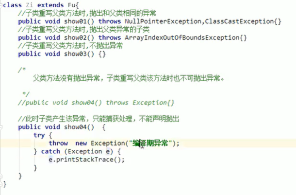 如果父类抛出了多个异常,子类重写父类方法时,抛出和父类相同的异常或者是父类异常的子类或者不抛出异常。 父类方法没有抛出异常,子类重写父类该方法时也不可抛出异常。此时子类产生该异常,只能捕获处理,不 能声明抛出。(也就是说,父类异常是什么样,子类异常就是什么样)