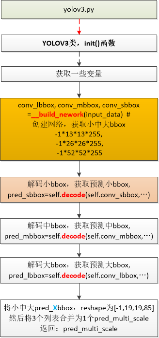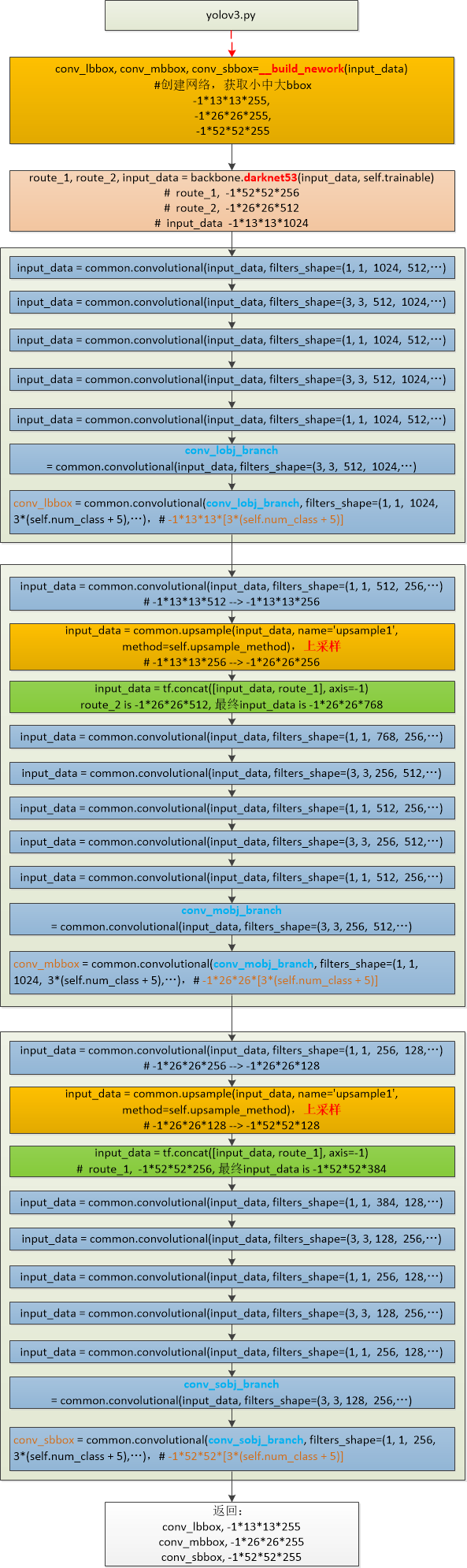 self.model = YOLOV3(self.input_data, self.trainable)然后进入yolov3.py代码,执行YOLOV3类的__init__函数,同样先是获取相关参数,然后先后调用了__build_nework(input_data) 函数来创建网络,并获取卷积后的大中小特征图;再调用decode()函数解码。