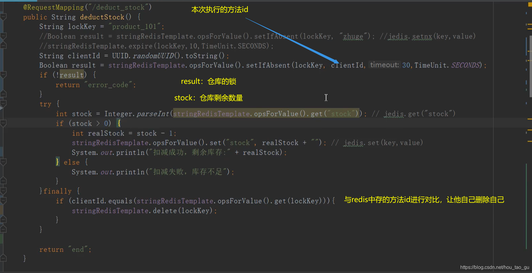 5.整个业务逻辑用try包裹,删除锁放在finally里,保证都能释放锁