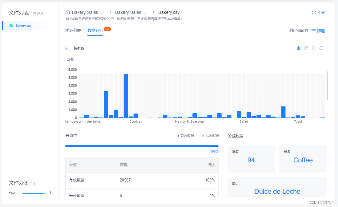 该数据集属于位于爱丁堡的一家面包店“The Bread Basket”。该数据集提供了从 26-01-11 到 27-12-03 期间在线从这家面包店订购不同商品的客户的交易详情。该数据集有 20507 个条目、超过 9000 个事务和 4 列。