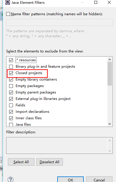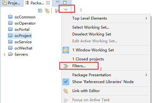 Eclipse如何让关闭的项目进行隐藏 、步骤一:步骤二:选中Closed projects点击ok即可版权声明:本文为BlackPlus28原创文章,遵循CC 4.0 BY-SA版权协议,转载请附上原文出处链接和本声明。原文链接:https://blog.csdn.net/BlackPlus28/article/details/83895965