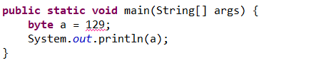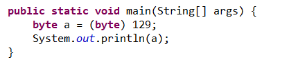 - byte a = 12; byte b = (byte) 129; byte c = (byte) 257;