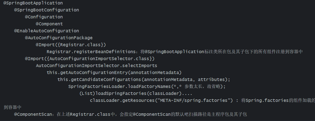 在SpringBoot程序的入口类上有个@SpringBootApplication注解。点击该注解,能看到这个注解上又标注了一堆注解,其中关键是@ComponentScan、@EnableAutoConfiguration