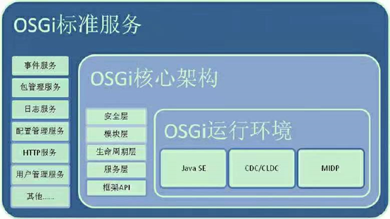 上图是OSGi标准服务的框架组成示意图,OSGi架构又被称为“微内核架构”,模块层、生命周期层和服务层的这三层规范共同组成了OSGi微内核的核心。