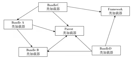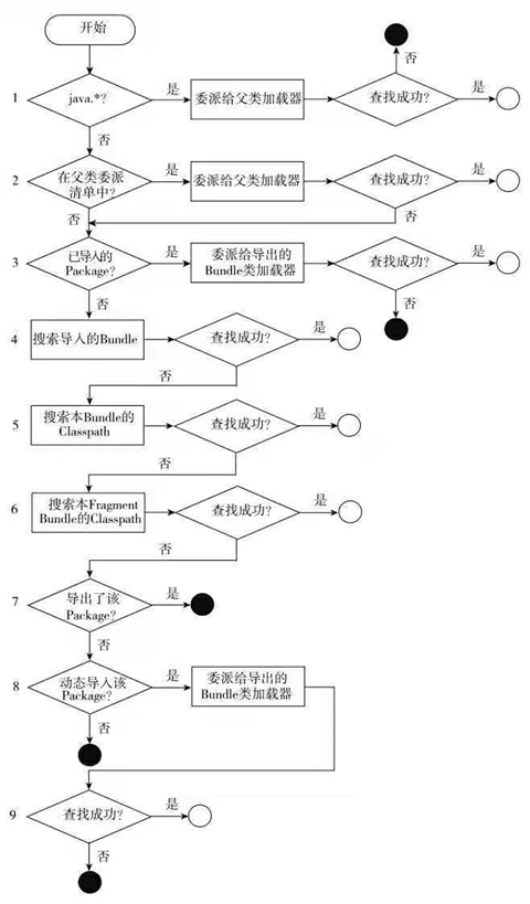 (3)双亲委派模型的第三次“被破坏”是由于用户对程序动态性的追求而导致的。这里所说的“动态性”指的是当前一些非常“热”门的名词:代码热替换(HotSwap)、模块热部署(Hot Deployment)等。OSGi实现模块化热部署的关键就是它自定义的类加载机制,其类加载过程(见2.1.4.2)中很多都是在平级的类加载器中进行查找的,都是不符合双亲委派模型的。
