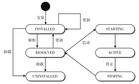 ❑生命周期层(Life Cycle Layer)。生命周期层从“动态”的角度描述了一个模块从安装到被解析、启动、停止、更新、卸载的过程,以及在这些过程中的事件监听和上下文支持环境。