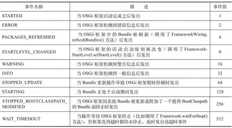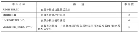 OSGi框架中在ServiceEvent类中定义了一个返回值为int的getType()方法,用于表明事件对象所代表的事件类型。服务层事件所包含的事件类型及含义如下表: