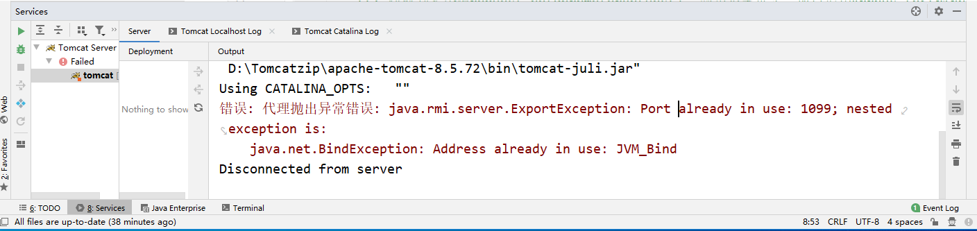 2、Error running 'Tomcat 8.5.72': Address localhost:1099 is already in use 未关掉服务器就退出了idea下次打开idea时出现的报错