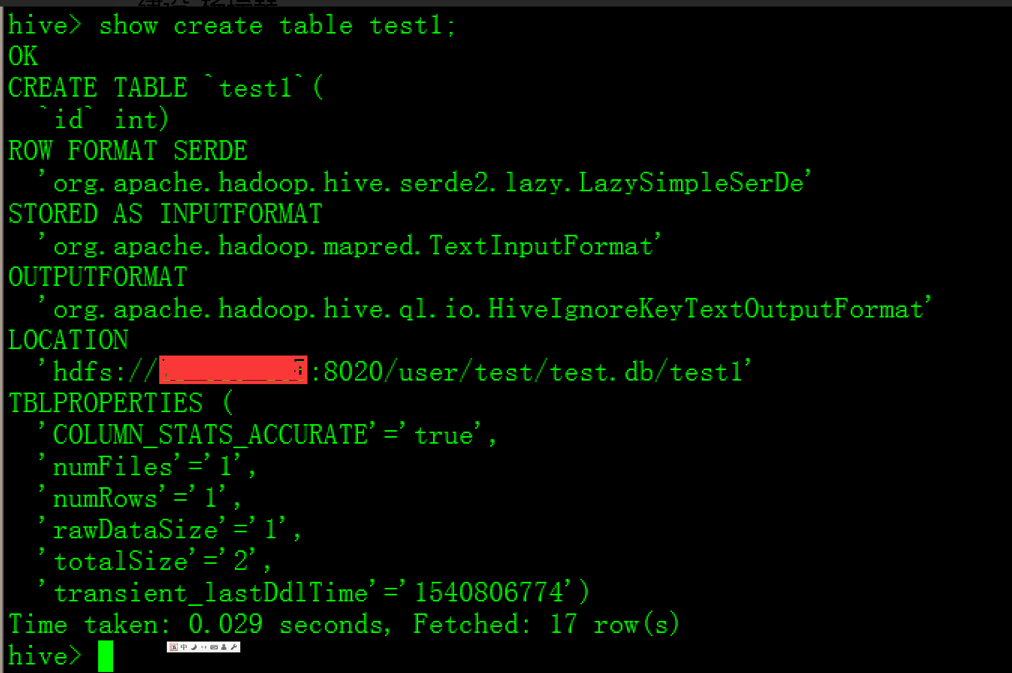 (2)重新新建了一个test1表,然后重新删除,发现hive库和hdfs上都删除了。