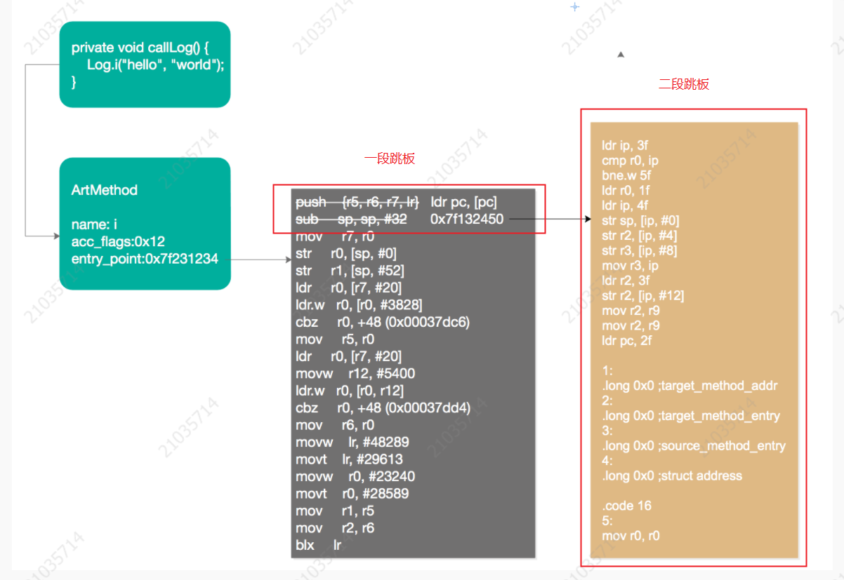3)在compiled_code的开始位置放置一段很短的跳转代码,称为“一段跳板”,作用是跳转到二段跳板。之所以弄一个一段跳板,是怕二段跳板太长,原方法的compiled_code区域放不下。