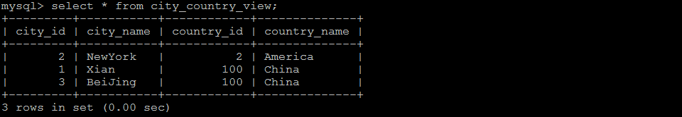 select t.*,c.country_name from country c , city t where c.country_id = t.country_id;查询视图 :