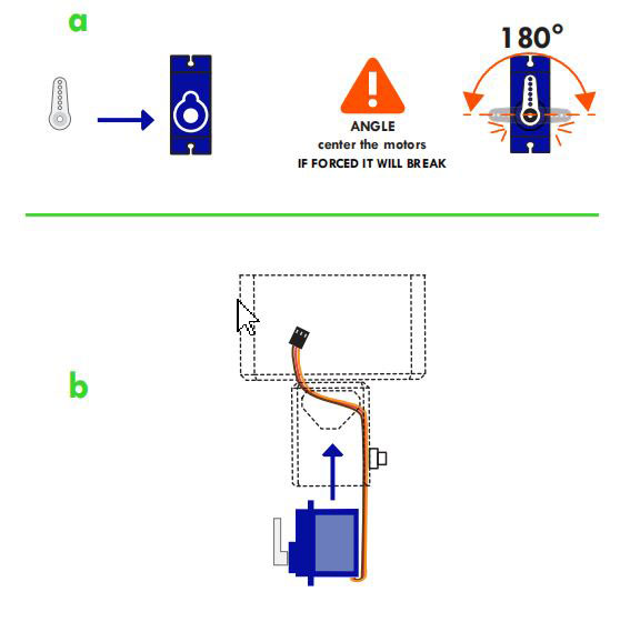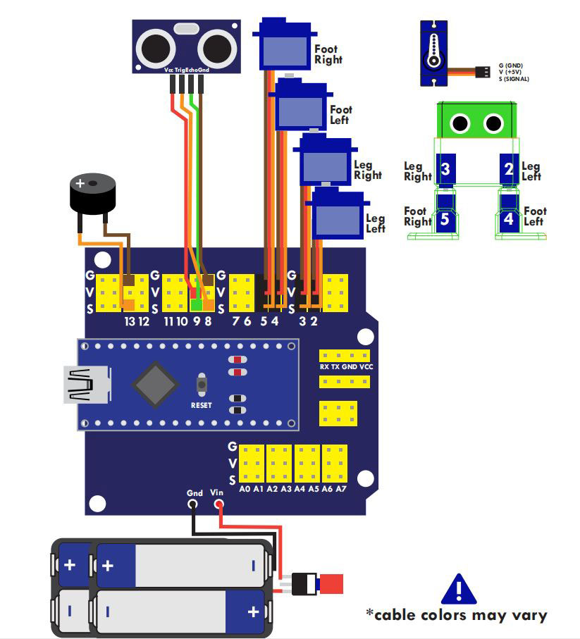 先把双腿部件连接到身体上微型鸵机处,要确保腿部相对于身体能够向左右两边各自转动90度。在对齐腿部之后用螺丝刀通过腿内部的小孔固定好.此处需注意将腿部顶端上的穿线孔与躯体下方的穿线孔靠近,使得稍后可以流畅穿线