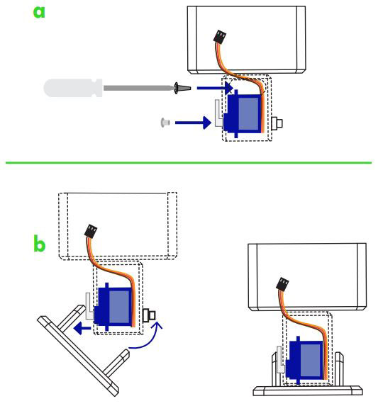 按照图示的方式来安装,但要注意把电线放置到躯体内部的槽位并通过腿部的小孔穿出来。一旦确定好他们的位置,就可以用螺丝刀从背后固定好她们。