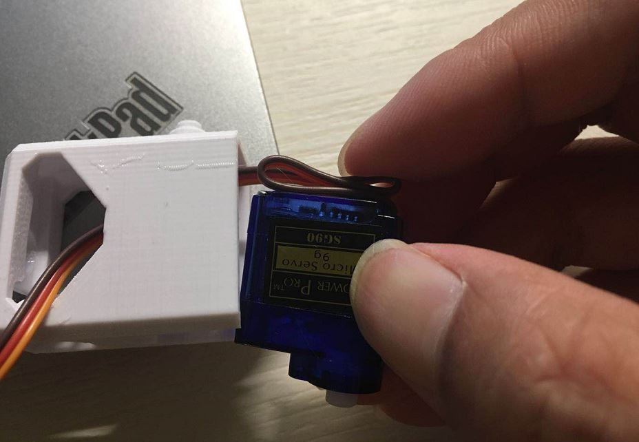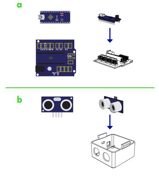 将超声波传感器推到眼睛的极限处,将Arduino nano安装到扩展板之后,你也可以将电池底座的线缆正极焊接到板子的Vin接线柱上,负极接到GND上。将连接好的板子,对准3d打印的头部上的USB连接口,再用至少两颗螺丝将他们固定到头部上.