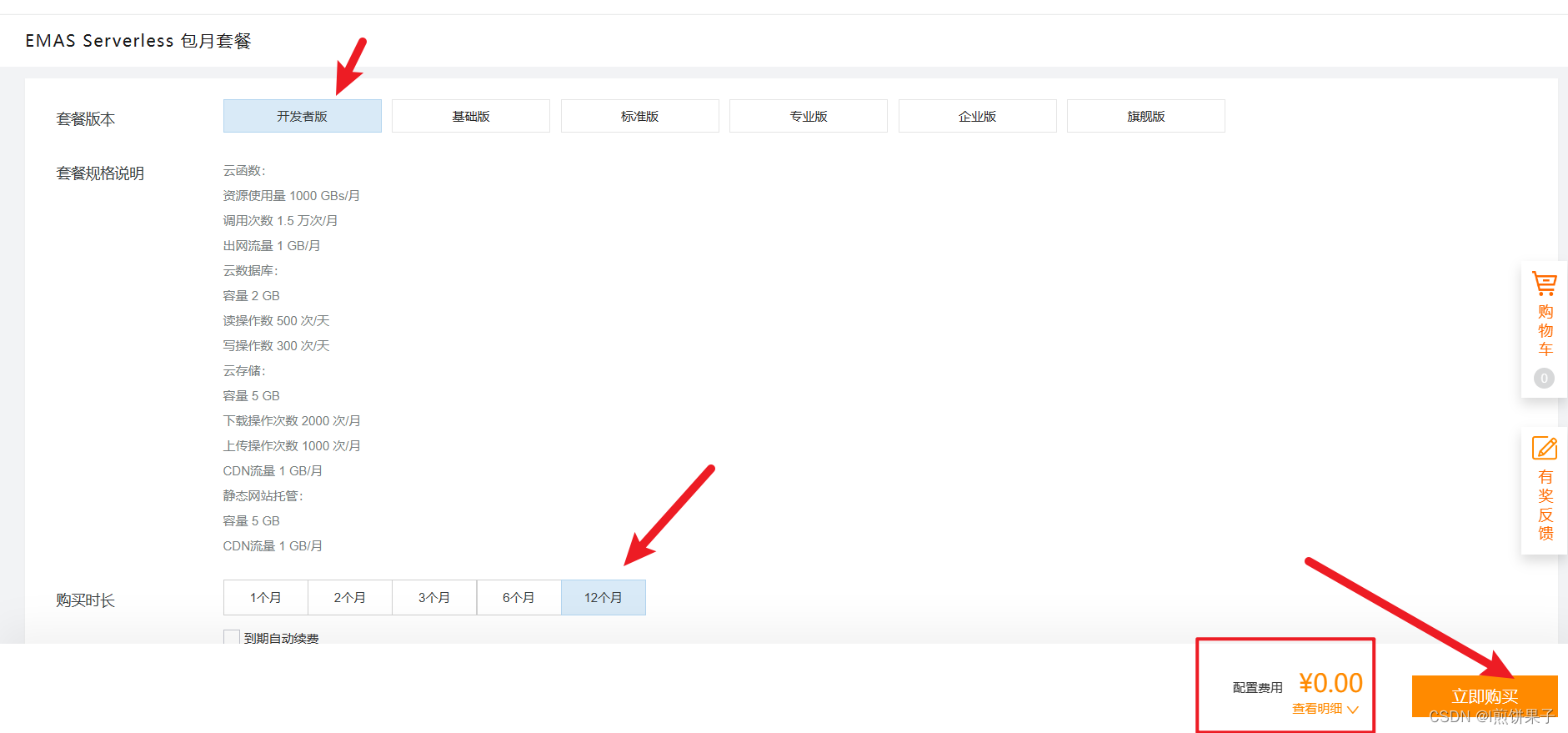 然后进行套餐的购买,勾选以下内容 (不要勾选自动续费,免费的套餐不能自动续费,如果打钩了,接下来的支付按钮就是灰色了,无法支付)
