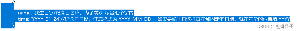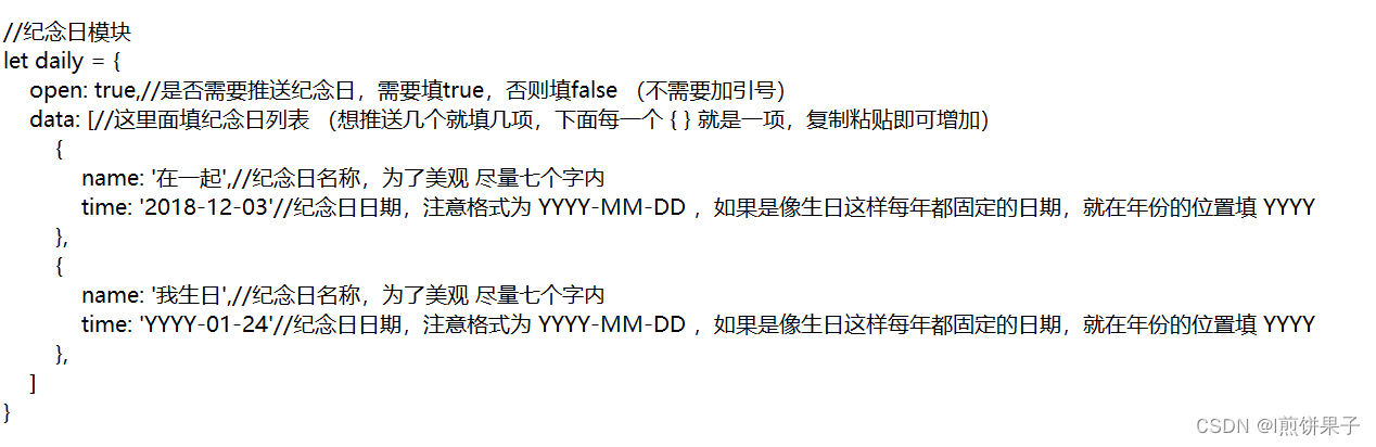 然后输入纪念日列表,这里提供了两个示例 (一个大括号 { } 包裹的是一个示例,每个大括号的后面要加英文逗号 )