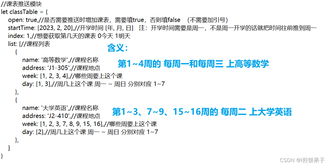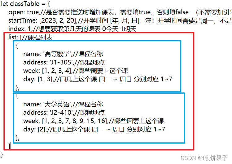 下图给了两个示例,可以自行添加更多数据 (一个蓝色框就是一个课程数据,复制粘贴之后改内容即可)