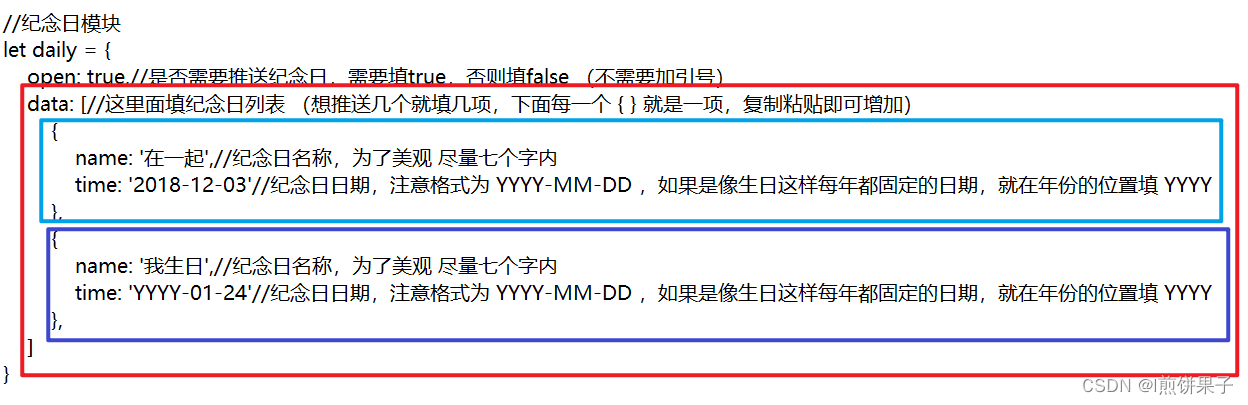 蓝色框框是示例1,紫色框框是示例2,在输入纪念日名称和日期的时候,在两个单引号中间输入,引号不能删掉,引号内不要有多余的空格,日期格式为 YYYY-MM-DD (比如 '2023-01-25' )